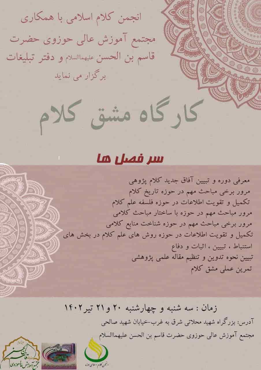 دوره مشق کلام توسط انجمن کلام اسلامی حوزه با همکاری مجتمع آموزش عالی حوزوی حضرت قاسم بن الحسن علیهماالسلام ودفتر تبلیغات اسلامی برگزار می گردد.