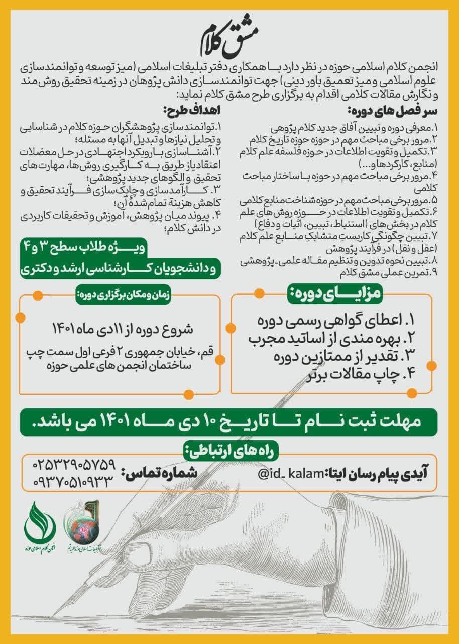 🔰انجمن کلام اسلامی حوزه در نظر دارد با همکاری دفتر تبلیغات اسلامی(میز توسعه و توانمندسازی علوم اسلامی و میز تعمیق باور دینی)جهت توانمندسازی دانش پژوهان در زمینه تحقیق روش‌مند و نگارش مقالات کلامی اقدام به برگزاری طرح مشق کلام نمایند؛