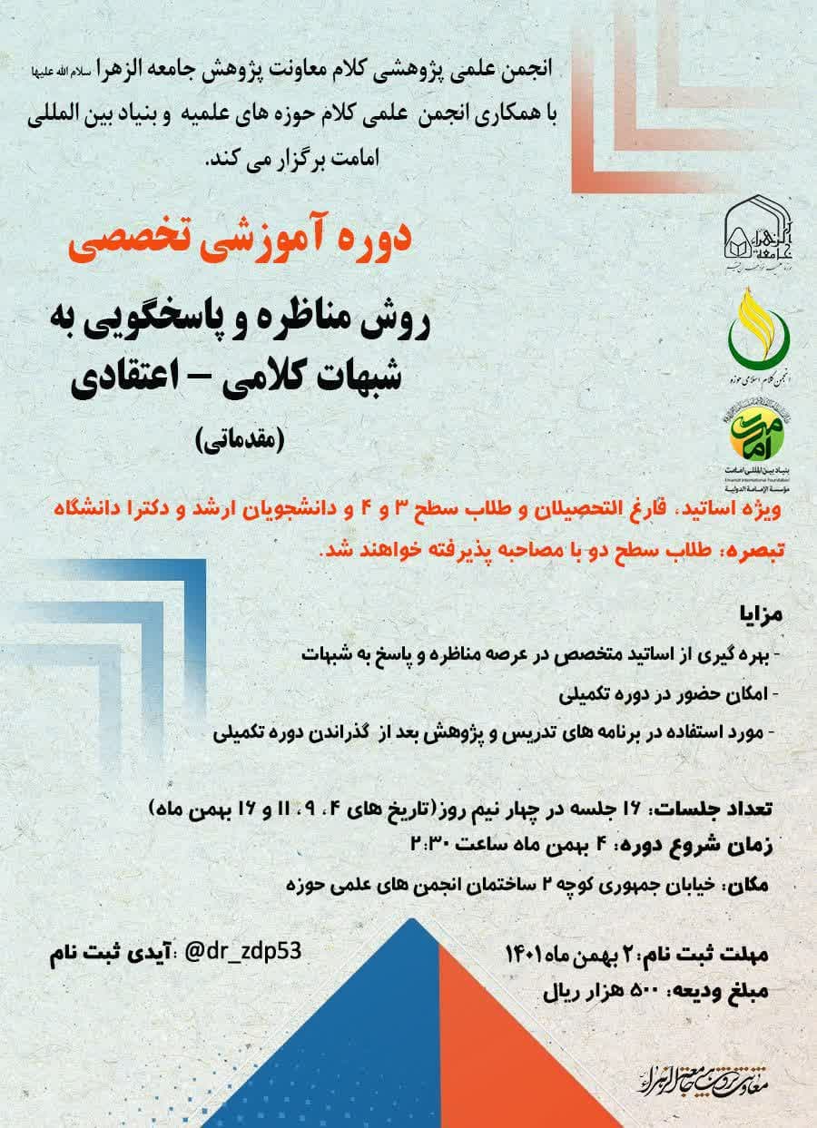 به گزارش روابط عمومی انجمن کلام اسلامی حوزه، انجمن کلام اسلامی حوزه با همکاری انجمن علمی پژوهشی کلام جامعه الزهرا سلام الله علیها و موسسه بینالمللی امامت دوره حضوری تخصصی آموزش مناظره و روش پاسخگویی به شبهات اعتقادی و کلامی، با حضور اساتید فرهیخته و بین المللی موسسه امامت زیر نظر استاد دکتر محمدتقی سبحانی برگزار می گردد.