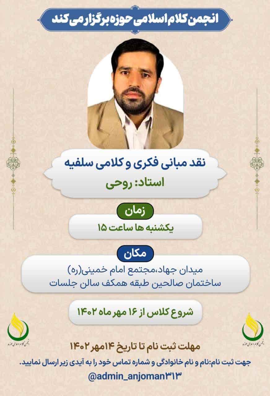 به گزارش روابط عمومی انجمن کلام اسلامی حوزه، درس نقد مبانی فکری و کلامی سلفیه؛ استاد روحی برگزار می گردد.