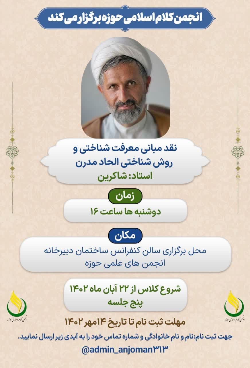 به گزارش روابط عمومی انجمن کلام اسلامی حوزه، درس نقد مبانی معرفت شناختی و روش شناختی الحاد مدرن؛ استاد شاکرین برگزار می شود.