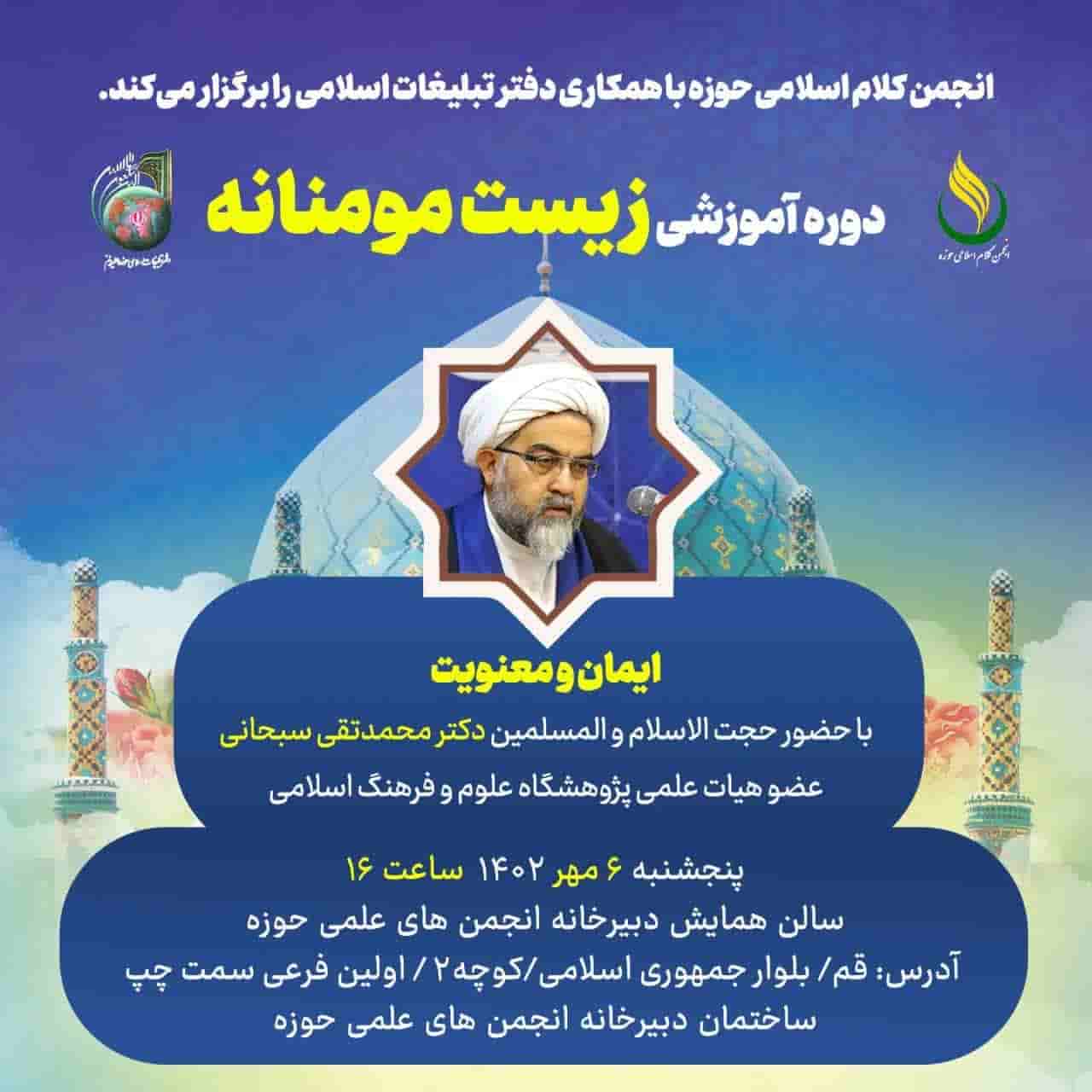 به گزارش روابط عمومی انجمن کلام اسلامی حوزه، انجمن کلام اسلامی حوزه با همکاری دفتر تبلیغات اسلامی دوره آموزشی زیست مومنانه را برگزار می‌کند.