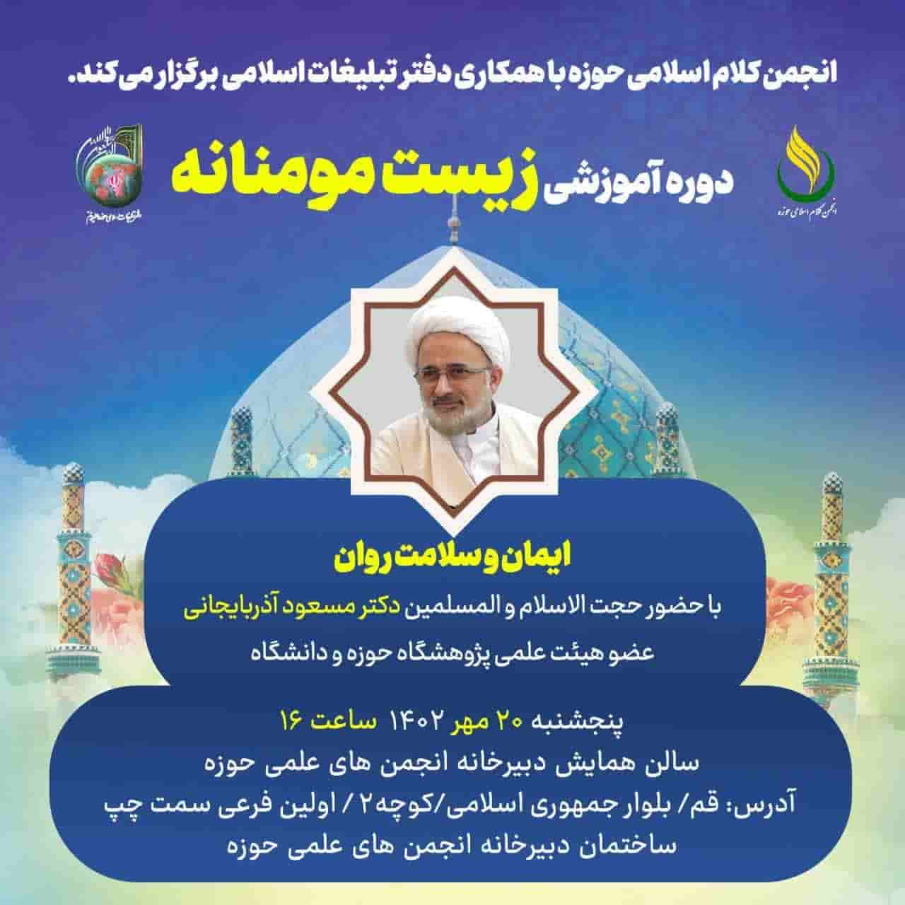 به گزارش روابط عمومی انجمن کلام اسلامی حوزه، نشست زیست مومنانه با موضوع “ایمان و سلامت روان” با حضور حجت الاسلام والمسلمین دکتر مسعود آذربایجانی عضو هیئت علمی پژوهشگاه حوزه و دانشگاه برگزار می گردد.